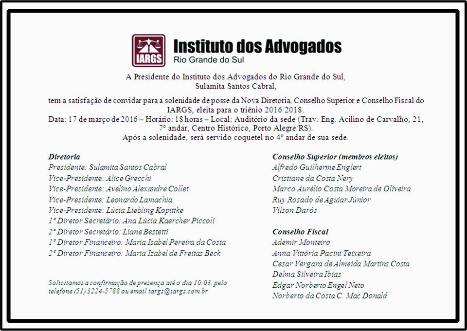 No ano em que é comemorado os 90 anos de fundação do Instituto dos Advogados do RS (IARGS), os membros da nova diretoria, do Conselho Superior (membros eleitos) e do Conselho Fiscal tomarão posse no próximo ia 17 de março, às 18h, no auditório da sede, localizado no sétimo andar. A presidente do IARGS, Sulamita Santos Cabral, será reconduzida ao cargo, reeleita por unanimidade, em chapa única, para o triênio 2016/2018.
